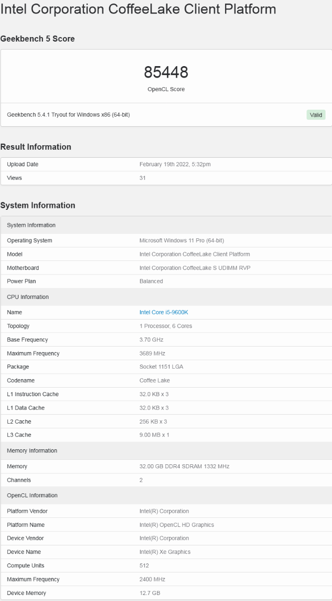 Флагманскую настольную видеокарту Intel Arc Alchemist заметили в Geekbench (Twitter @BenchLeaks), тестирование в OpenCL показывает, что модель продолжает наращивать производительность и с оценкой 85448 баллов уже приближается к NVIDIA GeForce RTX 2070. Сравнительно недавно, осенью прошлого года, результаты были хуже, тогда видеокарта могла конкурировать с RTX 2060, набирая около 69000 баллов. Очевидно, что в лабораториях Intel продолжается усердная работа, остаётся надеяться, что к запуску во втором квартале настольные игровые видеокарты будут готовы. Стоит отметить, что с прошлого тестирования на 300 МГц увеличилась пиковая частота графического процессора, она достигала 2400 МГц.