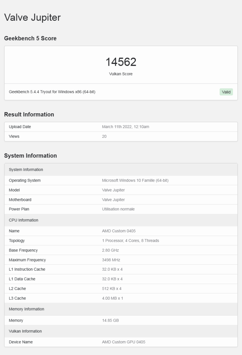 Valve накануне предоставила первые Windows драйверы для портативного игрового компьютера Steam Deck и теперь пользователи начинают тестировать устройство под Windows. Сегодня в Geekbench обнаружили первый результат встроенной графики в тесте, использующем графический API Vulkan, сообщает ресурс MyDrivers. Судя по информации в базе данных, встроенная графика набрала 14562 балла. Стоит напомнить, что это решение на базе графической архитектуры RDNA 2, оно содержит 8 блоков Compute Units (CU), общее количество потоковых процессоров составляет 512 единиц и работают они на частоте до 1,6 ГГц.