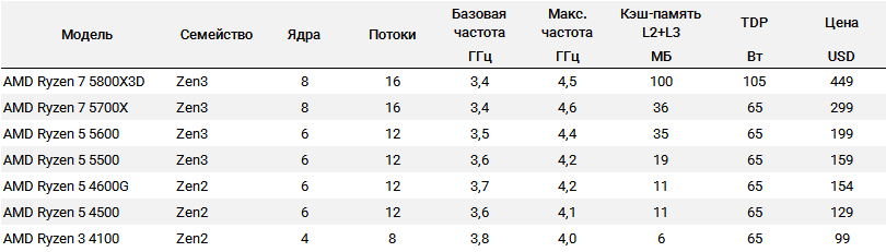 Во-вторых, готовится ещё три модели в серии 5000: 8-ядерный Ryzen 7 5700X и 6-ядерные Ryzen 5 5600 и 5500 по цене 299, 199 и 159 долларов соответственно, это ещё не все. Следующими на очереди тройка моделей 4000 серии, первым в глаза бросается новый APU — это 6-ядерный Ryzen 5 4600G за 154 доллара. Пока неизвестны характеристики его интегрированной графики. Далее за 129 долларов компания предложит 6-ядерный Ryzen 5 4500 и, наконец, за 99 долларов Ryzen 3 4100 — 4-ядерный и 8 поточный процессор. Все новые процессоры Ryzen 5 и Ryzen 3 для настольных ПК поставляются в комплекте с кулером AMD Wraith Stealth и поступят в продажу с 4 апреля.