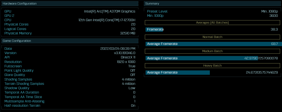 В базе данных бенчмарка Ashes of the Singularity появился результат системы с дискретной графикой Intel Arc Alchemist. Это мобильная платформа с процессором Intel Core i7-12700H и видеокартой Arc A370M. Система тестировалась при настройках Min_1080p и набрала 3600 баллов. Общая оценка, к сожалению, мало о чём говорит, в базе аналогичный результат можно найти как для современных систем, так и для систем с видеокартами, выпущенными 8 лет назад. Но можно попробовать оценить производительность по среднему количеству FPS для аналогичных современных решений.