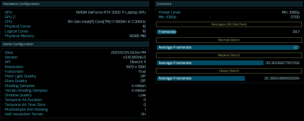 Для Intel Core i7-12700H и Arc A370M средний FPS в сценариях Normal и Medium Batch равен 68,7 и 42,9 кадрам соответственно. Это больше, чем у связки i7-10750H и NVIDIA GeForce RTX 3050 или i7-11800H и RTX 3050 Ti. Однако если говорить о Heavy Batch, где нагрузка на видеокарту должна возрастать, Arc A370M немного проигрывает: 24,6 кадра против 29,8 и 32,4 соответственно. Все тесты проводились с графическим API DirectX 11 и ранее специалисты отмечали, что в Heavy Batch слабые видеокарты могут получить большее преимущество в DirectX 12 за счёт оптимизаций и возможности работать с большим количеством вызовов API. В конечном итоге, с такими решениями как GeForce RTX 3050/Ti младший вариант Intel Arc конкурировать должен.