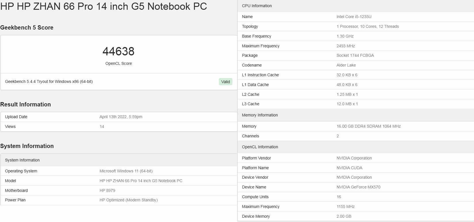В конце прошлого года NVIDIA представила несколько новых мобильных видеокарт вместе с MX570. Это вариант начального уровня, основанный на принадлежащем семейству Ampere графическом процессоре GA107, что вызывает некоторый интерес. Ноутбуки на базе этой видеокарты должны появиться в течение весны, некоторые модели уже тестируются и данные об попадают в общедоступные базы. Так в Geekbench отметился ноутбук HP Z66 Pro из серии тонких и лёгких устройств бизнес класса, участие в тестировании принял образец на базе Core i5-1235U и MX570 с 2 ГБ GDDR6 памяти.