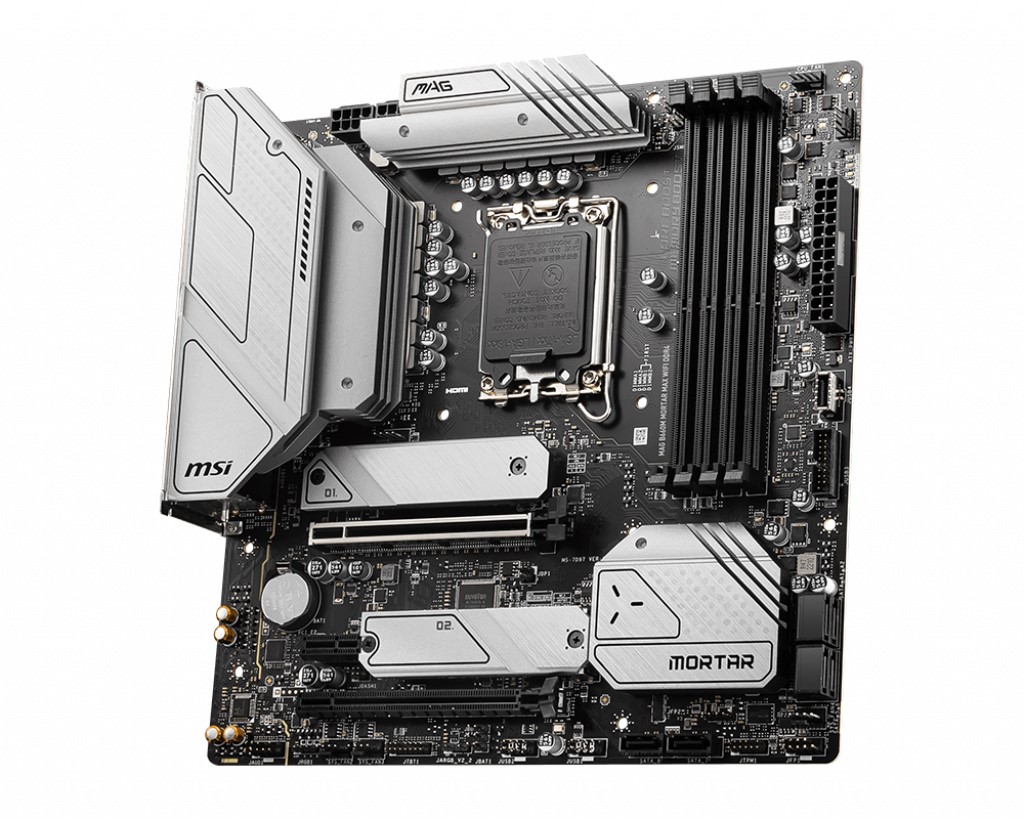 MSI MAG B660M MORTAR MAX WIFI DDR4 хорошо оснащена, питание реализовано по схеме 12+1+1 Duet Rail Power System, четыре слота оперативной памяти позволяют установить до 128 ГБ. Разъёмы для подключения накопителей включают: 4×SATA 3.0 от чипсета, 2×SATA 3.0 от дискретного контроллера ASMedia ASM1061, 2×M.2 PCI-Express 4.0 x4. Есть 2,5-гигабитный сетевой адаптер Realtek 8125BG, упомянутый выше модуль беспроводной связи Intel, аудио чип Realtek ALC897. На задней панели много USB разъёмов: 8×USB 2.0, 2×USB 3.2 Gen 1, 4× USB 3.2 Gen 2, 1× USB 3.2 Gen 2x2 (Type-C).