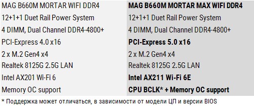 MSI анонсировала в мае материнскую плату MAG B660M MORTAR MAX WIFI DDR4. Модель без обозначения MAX уже была представлена производителем ранее, одно из отличий новой модификации — наличие внешнего тактового генератора и фирменной технологии OC ENGINE, вместе они позволят разгонять неразгоняемые процессоры Intel Alder Lake-S, модели без индекса K. Также новая версия поддерживает PCIe-Express 5.0 x16 для установки видеокарт и получила новый модуль беспроводной связи Intel AX211 Wi-Fi 6E. В зависимости от региона, модель ожидается в июле или августе, похоже, всё идёт по плану, поскольку плата накануне появилась на официальном сайте производителя.