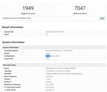 В Geekbench замечен AMD Ryzen AI 5 330 «Krackan Point 2» с четырьмя ядрами и графикой Radeon 820M