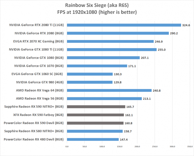 «Rainbow Six Siege» запускалась с высокими настройками качества изображения с Temporal AA и 4x AF. V-Sync и ограничение частоты кадров были отключены, был использован встроенный игровой тест. Rainbow Six Siege показывает, что лучшая карта - это Sapphire Nitro + Radeon RX 590 Special Edition. Эта карта имеет самую низкую тактовую частоту ядра, но это единственная карта с разогнанной памятью. Похоже, Sapphire придумала выигрышную комбинацию здесь. После игры на всех трех картах в течение пары недель разница между ними действительно не ощущается. Карты PowerColor Red Devil Radeon RX 590 и XFX Radeon RX 590 были на 3% медленнее на 1080P и 1440P, поэтому говорить о значительном преимуществе в производительности нельзя.