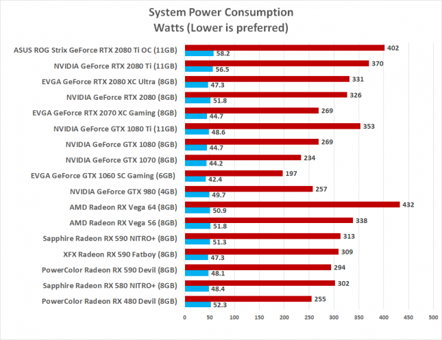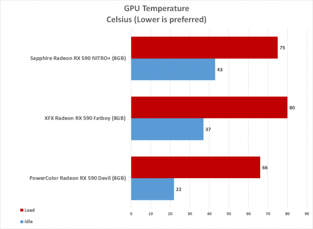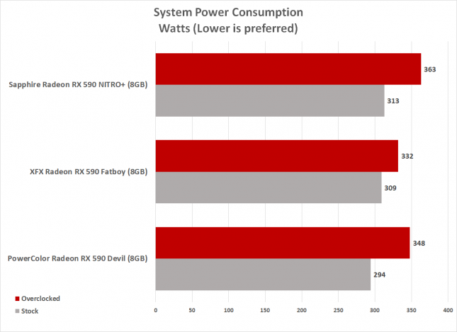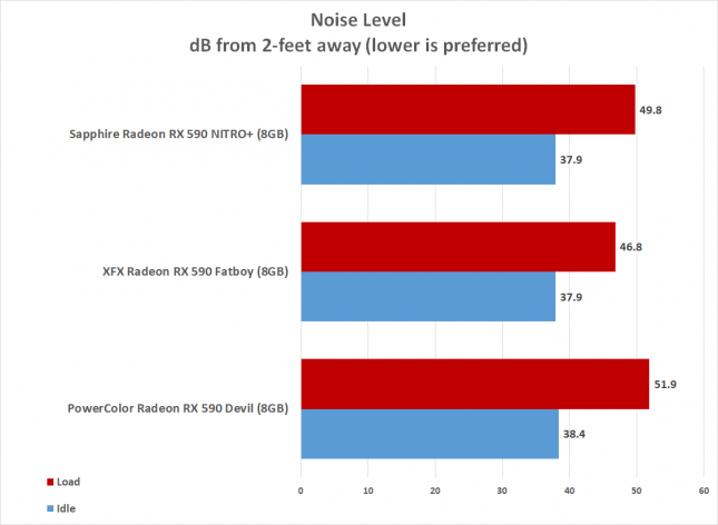 Тест энергопотребления проводился на измерителе мощности Kill-A-Watt. Для состояния простоя показывался только рабочий стол. Для состояния загрузки запускался Rainbow Six Siege в разрешении 1440р. Максимальное потребление показал Sapphire Nitro + Radeon RX 590 8GB Special Edition, XFX Radeon RX 590 Fatboy потреблял на 4 Вт меньше, а затем PowerColor Radeon RX 590 Red Devil на 19 Вт меньше.