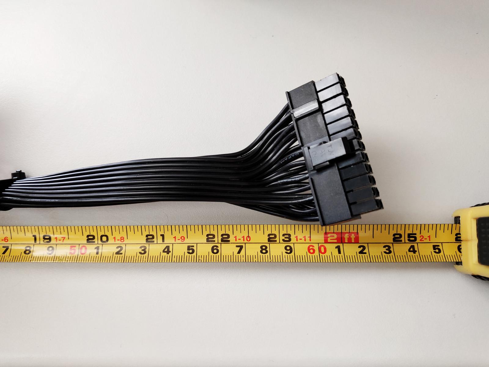 Длина кабеля для питания материнской платы (20+4 PIN) составляет 60 см. Все кабели я не стал измерять, кажется, что хватит их для любого корпуса. На фото ниже можно примерно оценить.