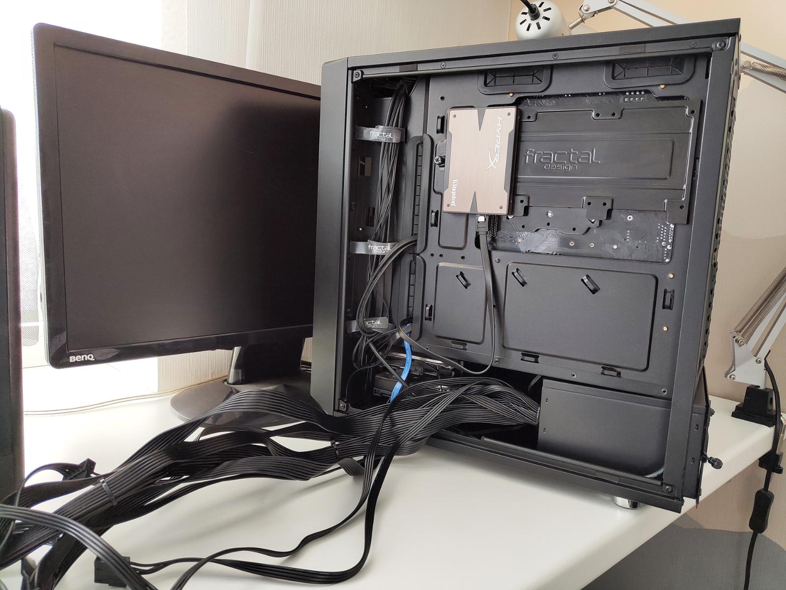 Правая сторона корпуса без крышки выглядит менее аккуратно, но благодаря плоским кабелям легко всё уложить даже в таком небольшом корпусе. Понравилось, как чётко защёлкиваются кабели при подключении, разъёмы к накопителям сидят плотно и надёжно.