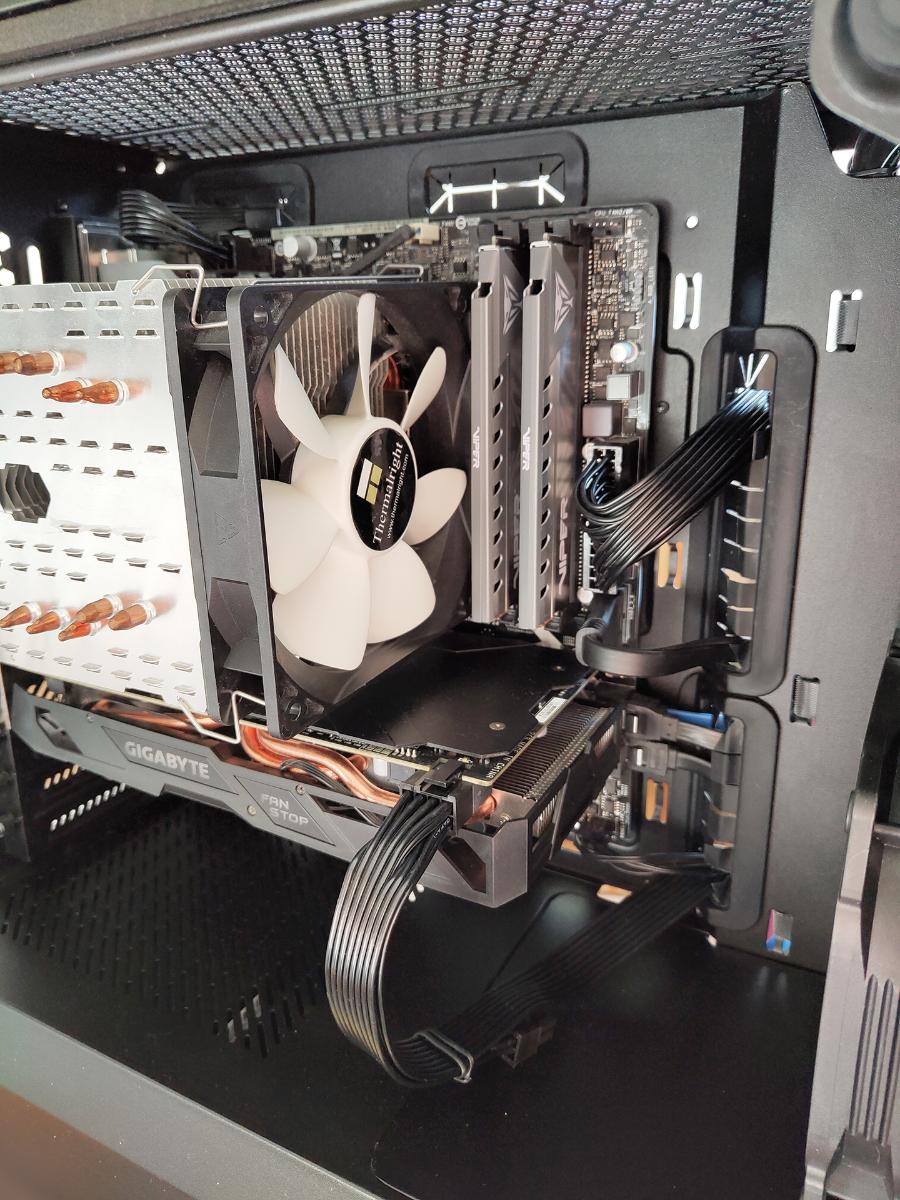 Затем подключаю кабели питания к материнской плате и к видеокарте (тут, наверное, можно было изящнее подвести кабель, но я просто провёл по низу корпуса, потоку воздуха от вентилятора на вдув это не должно помешать).