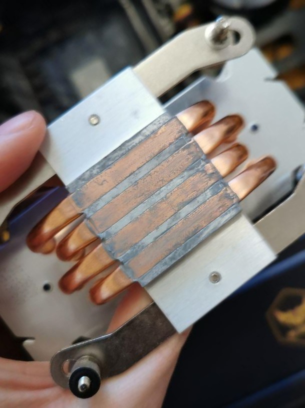 Хотя, на первый взгляд все довольно неплохо: четыре тепловых трубки, крепление о четырех болтах, а не двух, как это сделано даже в более дорогих продуктах. Но основание... оставляет желать лучшего: медь вперемешку с алюминием в самом горячем месте - это точно минус. Тем более в сборках с райзенами последнего поколения, где, как мы уже разобрались, и так посредственная теплоотдача. Впрочем, тесты покажут, что из себя представляет этот винегрет. Тем более отпечаток довольно неплох: