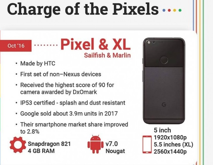 И вот, осенью 2016 года началась эра Pixel. Смартфоны первого поколения отличались только размерами и разрешением своих экранов. Они стали лучшими камерофонами на рынке по версии DxOMark. В 2017 году Google продала более 3.9 млн единиц Pixel и Pixel XL, а доля рынка компании выросла до 2.8%.