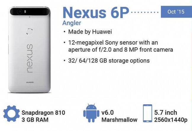 В октябре 2015 года появилось сразу два новых Nexus. Бюджетный, Nexus 5X, получил чип Snapdragon 808, 2 Гб ОЗУ, 16/32 Гб ПЗУ и FHD экран диагональю 5.2”. Разрешение основной камеры составило 12.3 Мп, а фронтальной – 5 Мп.