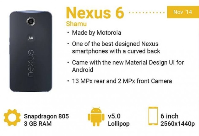 Nexus 6 сделала компания Motorola и получилось это у нее так себе. 6-дюймовый QDH дисплей, процессор Snapdragon 805 и две камеры с разрешением 13 Мп и 2 Мп не принесли успеха девайсу.