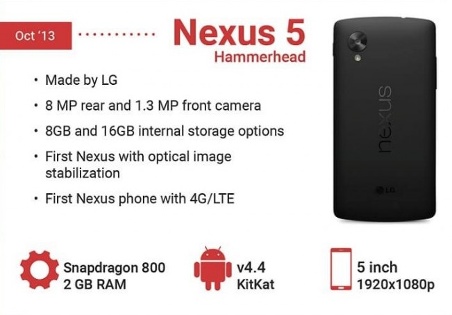 В Nexus 5 Google и LG реализовали поддержку 4G. В зависимости от версии объем ПЗУ составлял 8 Гб или 16 Гб. Разрешение экрана и диагональ увеличились по сравнению с предшественником – Full HD и 5” соответственно.