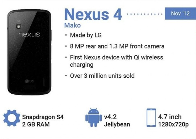 Nexus 4 в 2012 году был разработан компанией LG. Его оборудовали чипом Snapdragon S4 и 2 Гб ОЗУ. Диагональ экрана немного выросла и составила 4.7”. Продажи смартфона составили 3 млн единиц. Nexus 4 стал первым устройством серии, которое обзавелось беспроводной зарядкой.
