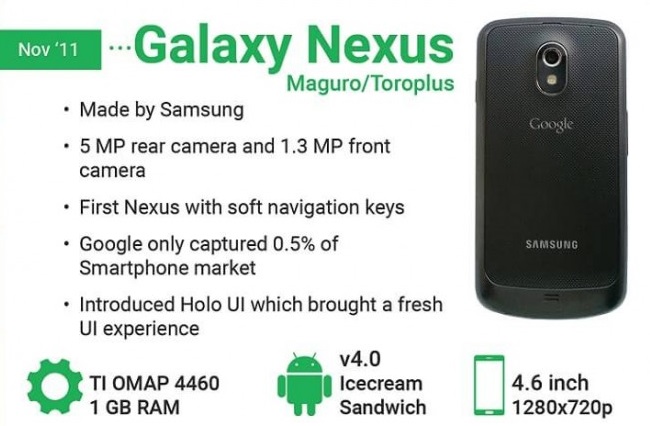 В ноябре 2011 был выпущен Galaxy Nexus с ОС Android 4.0. Смартфон получил 1 Гб ОЗУ и большой HD дисплей диагональю 4.6”. Вместе с ним была представлена оболочка Holo UI. В то время доля Google на рынке смартфонов составляла лишь 0.5%.