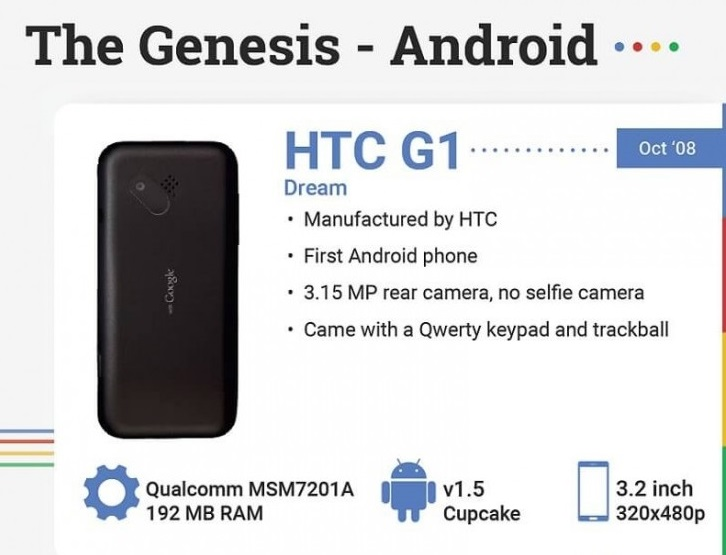 HTC G1 получил SoC Qualcomm MSM7201A в паре со 192 Мб ОЗУ. Разрешение дисплея составило 320 х 480 пикселей, а диагональ – 3.2”. Кроме того, смартфону досталась ОС Android 1.5, Qwerty-клавиатура и одна камера на 3.15 Мп. Анонс HTC G1 состоялся в октябре 2008 года.