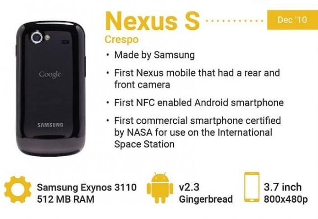 В декабре 2010 года был выпущен Nexus S. Производилась тогдашняя новинка мощностями Samsung. Как следствие, она получила чипсет Exynos 3110. Объем оперативной памяти составил 512 Мб. Параметры дисплея также не изменились по сравнению с Nexus One. Зато Nexus S получил фронтальную камеру и стал первым Android-смартфоном с чипом NFC на борту.