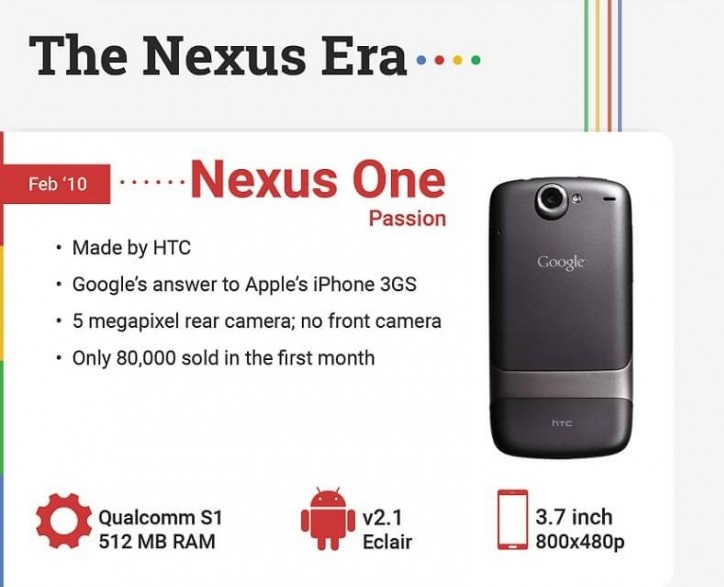 Почти через полтора года началась эра Nexus. Первый смартфон линейки назывался Nexus One и также производился на заводах HTC. Он стал своеобразным ответом Google на iPhone 3GS. Девайсу досталась камера на 5 Мп, процессор Qualcomm S1 и 512 Мб оперативки. Диагональ экрана составила 3.7”, а разрешение – 800 х 480 пикселей.