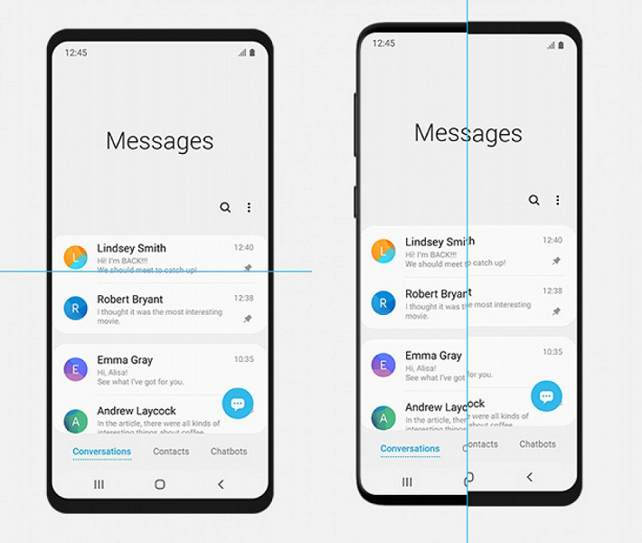 Демонстрируя возможности нового фирменного программного обеспечения One UI, производитель «случайно» показал публике модель Galaxy S10 в сравнении со стандартной версией пока еще текущего поколения. На изображениях ниже можно видеть наличие круглого отверстия под фронтальную камеру в правом верхнем углу экрана. Также можно выделить более тонкие рамки сверху и снизу от дисплея.