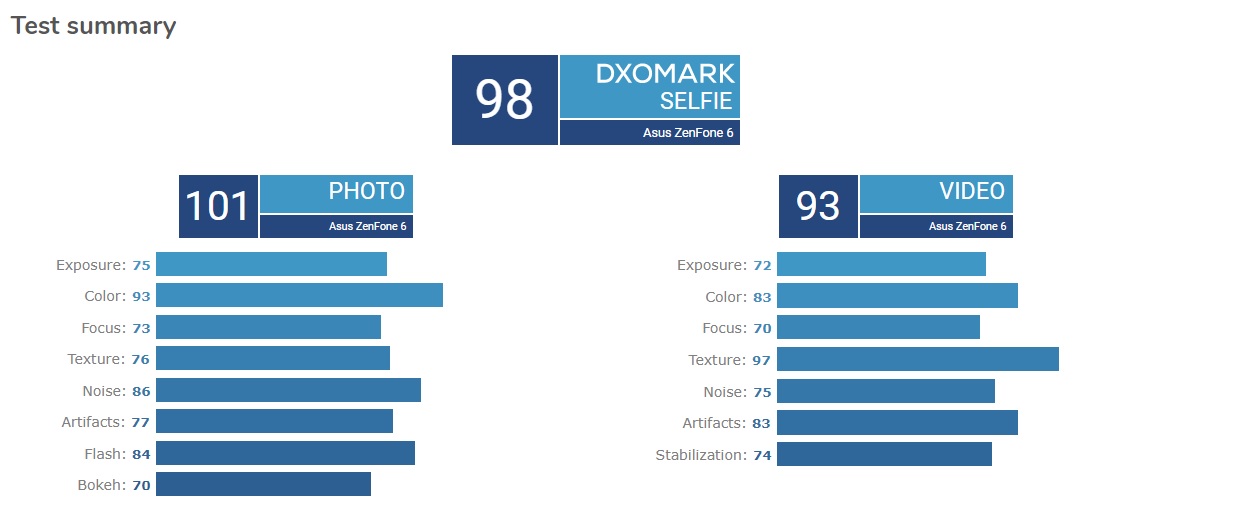 С общим результатом 98 баллов ASUS ZenFone 6 стал лучшим решениям для любителей селфи по версии DxOMark. Позади остались такие флагманы этого и прошлого годов, как Samsung Galaxy S10 5G (97 пунктов), Galaxy S10 Plus (96 пунктов), Galaxy Note 9 и Google Pixel 3 (по 92 пункта), Huawei P30 Pro (89 пунктов). С 98 «попугаями» ZenFone 6 мог бы занять место в конце второго десятка сводного рейтинга основных камер.