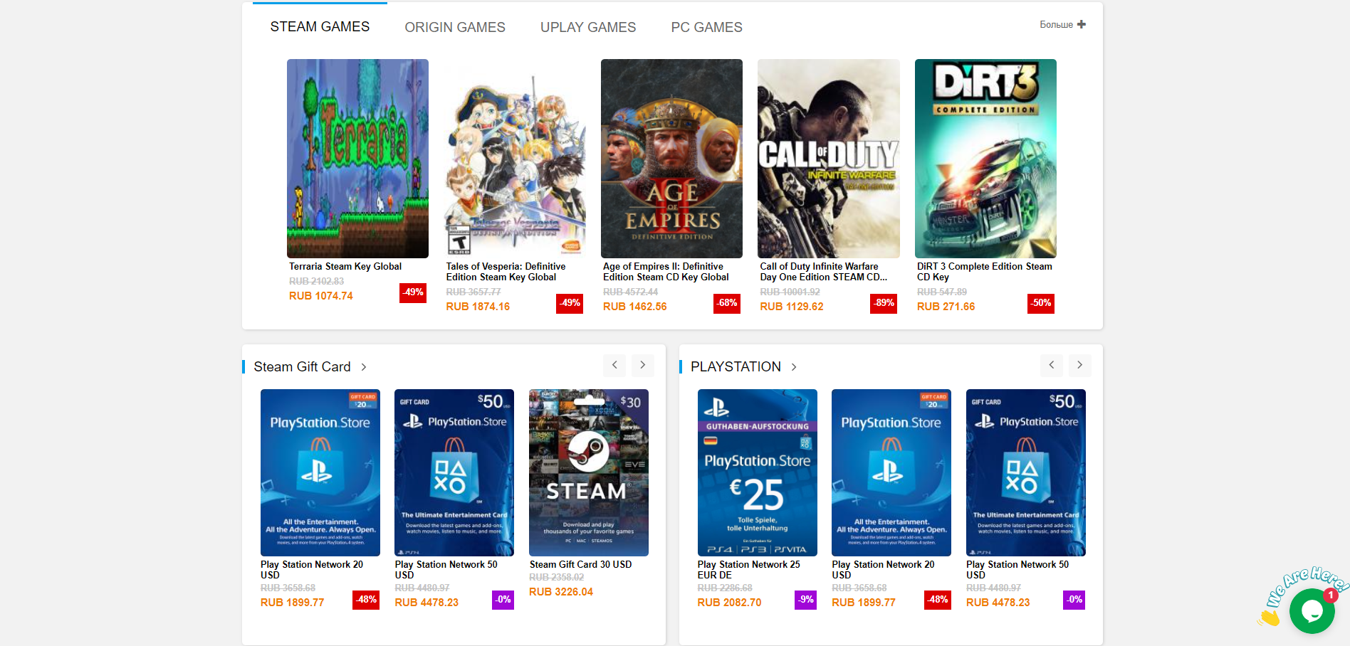 Если смотреть на домашнюю страницу сайта, складывается впечатление, что кроме ключей для видеоигр здесь ничего нет. На самом деле этот совсем не так, но придётся поискать. Листая главную страницу сайт вниз, мы находим подарочные карты в STEAM и PlayStation Store.