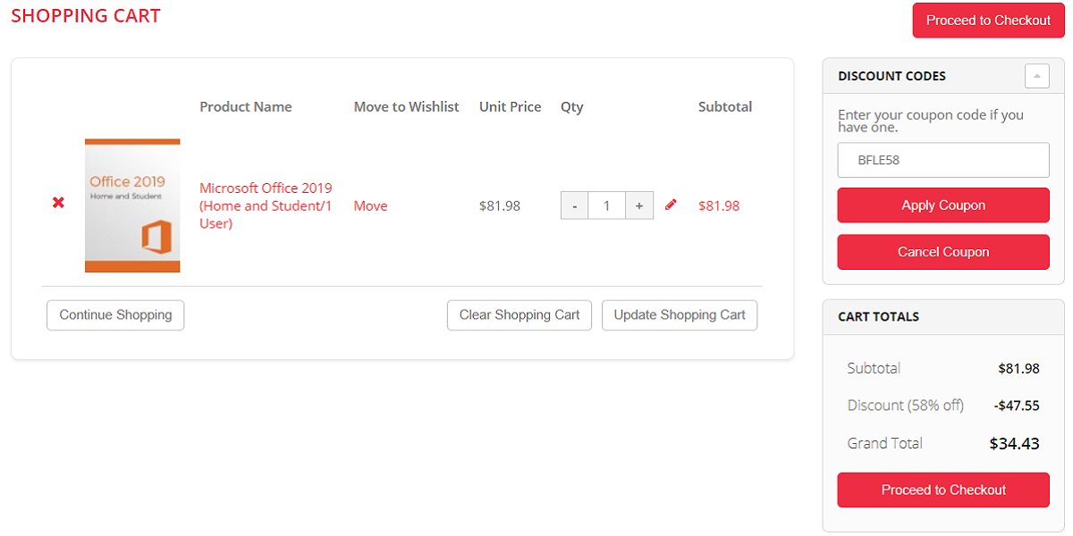 Как покупать в интернет-магазине, рассмотрим на примере Microsoft Office 2019 Home & Student. Цена составляет почти 82 доллара. Добавляем товар в корзину, вводим промокод BFLE58 и видим, что стоимость упала до 34,43 доллара.