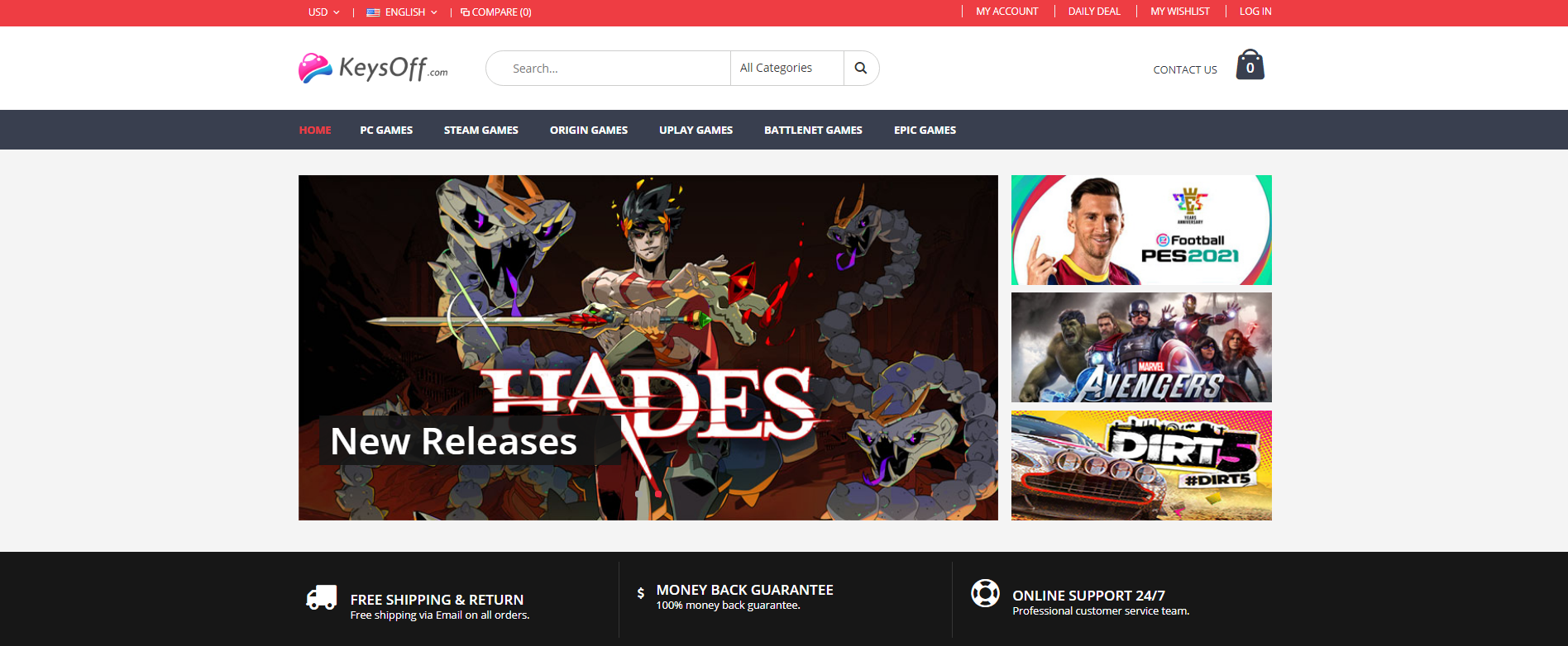 В магазине KeysOff нас ждёт немало ключей для игровых проектов. Например, сразу же при открытии домашней страницы мы видим несколько рекламных предложений. Сюда входят Pro Evolution Soccer 2021, Avengers, DiRT 5, Fall Guys и Hades, лучшая игра 2020 года по версии журнала Time.