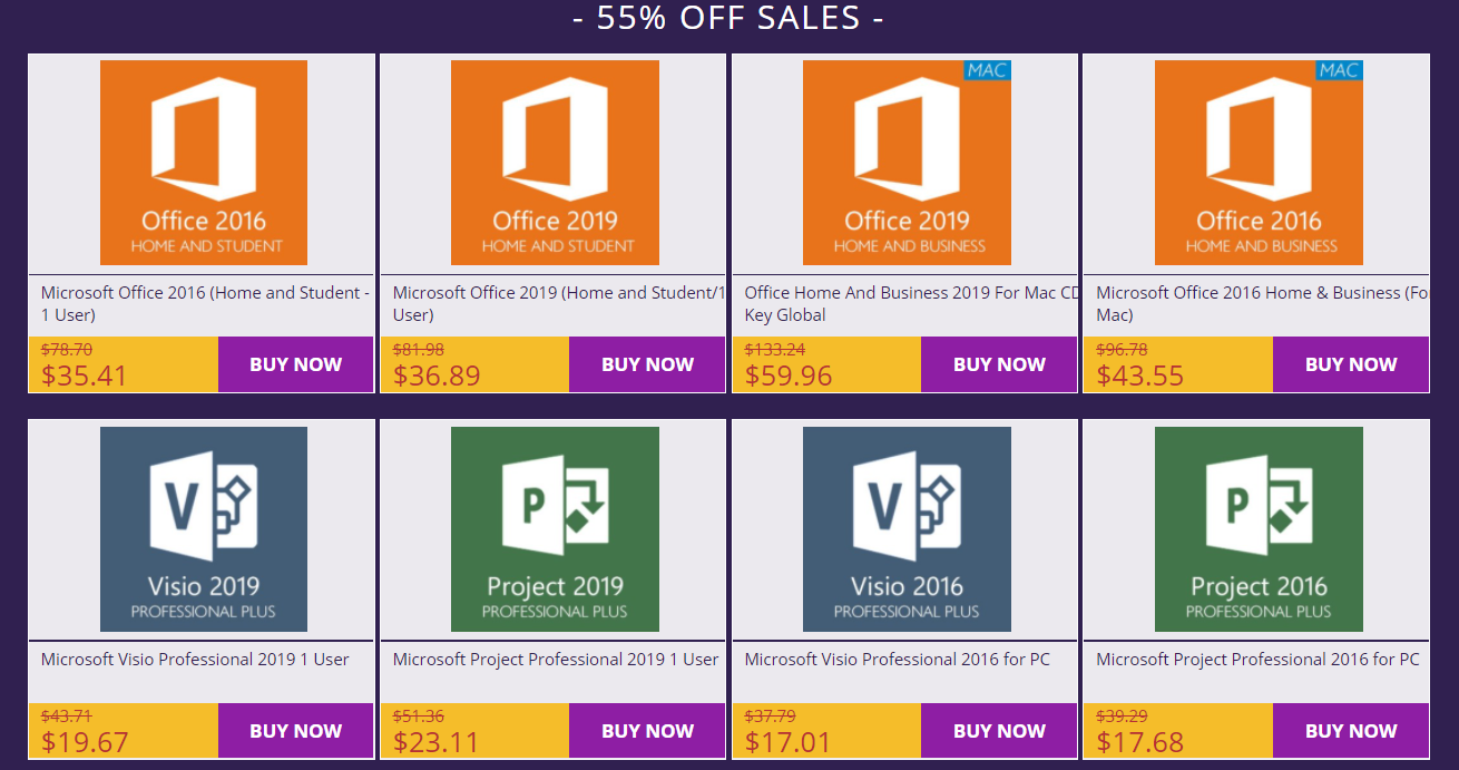 Этот раздел будет посвящён скидкам 55%. Получить их можно с промокодом BFLE55. Комплект Microsoft Office 2016 Home & Student по акции стоит 35,41 доллара. За более новое издание 2019 года отдать придётся почти на полтора доллара больше.