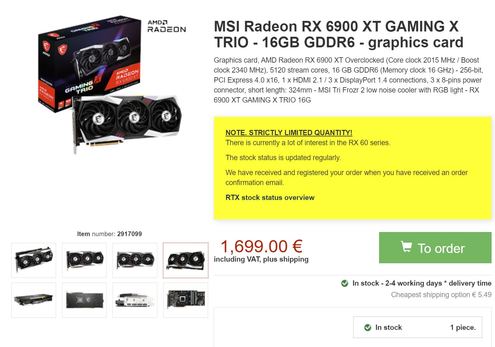 На сайте магазина Proshop уже можно купить графический ускоритель MSI Radeon RX 6900 XT GAMING X TRIO за 1699 евро. Заметим, что референсная модель Radeon RX 6900 XT стоит 700 евро. При этом на странице товара есть отметка, что количество видеокарт ограничено в связи с высоким спросом на серию Radeon RX 6000.