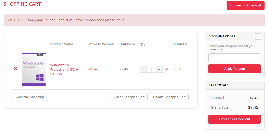 Чтобы оформить заказ, нужно выбрать желаемый продукт и добавить его в корзину. Рассмотрим на примере ключа для операционной системы Windows 10 Professional. OEM-лицензия стоит 7,45 доллара. В корзине есть поле для ввода промокода, но в нашем случае он не нужен.
