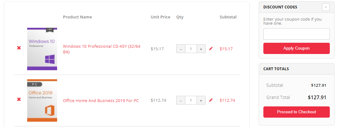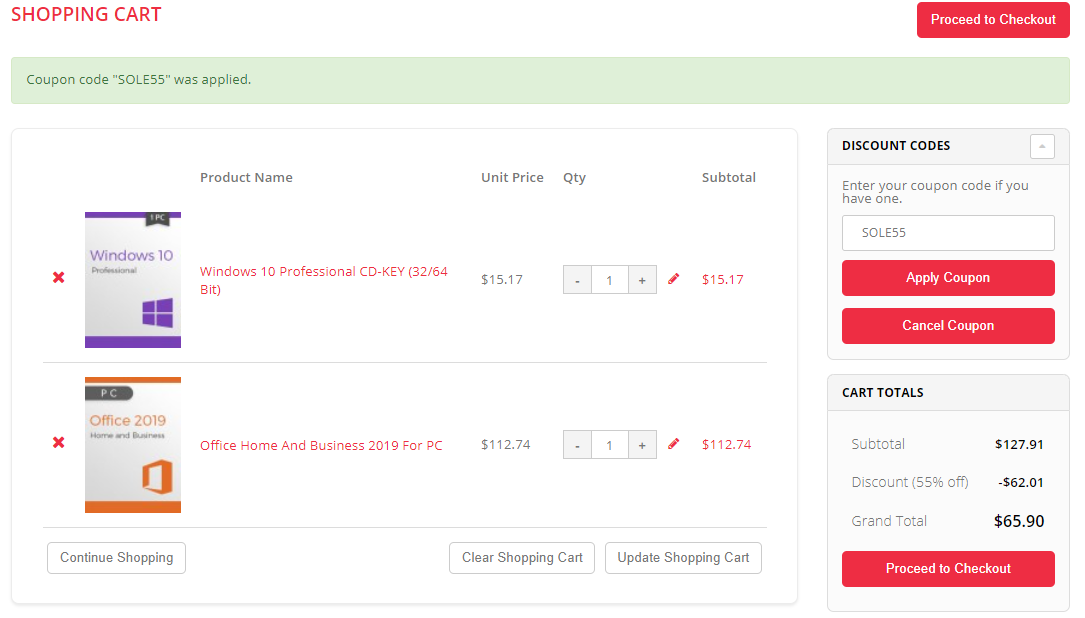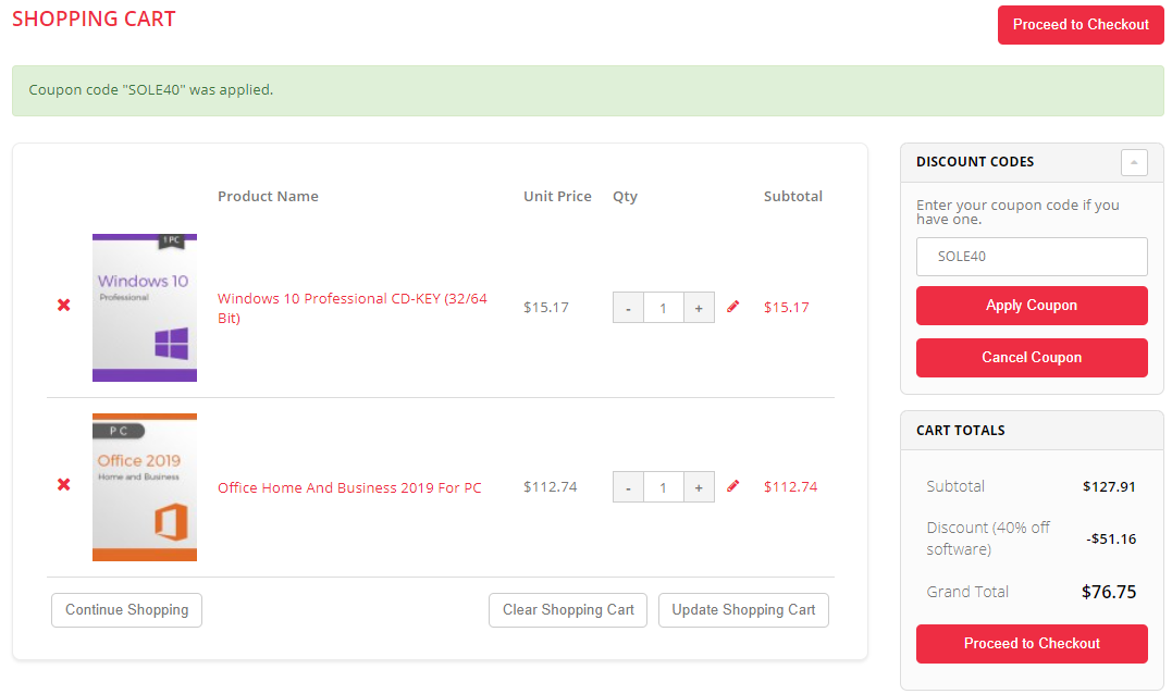 Например, нам нужно приобрести лицензию на операционную систему Windows 10 | Профессиональная вместе с MS Office 2019 Home & Business. Цена в магазине составляет 15,17 доллара и 112,74 доллара соответственно. Общая сумма – без малого 128 долларов. Но мы-то помним, что на первое предложение действует скидка 40% с промокодом SOLE40, а на второе купон SOLE55 позволяет снизить стоимость на 55%.