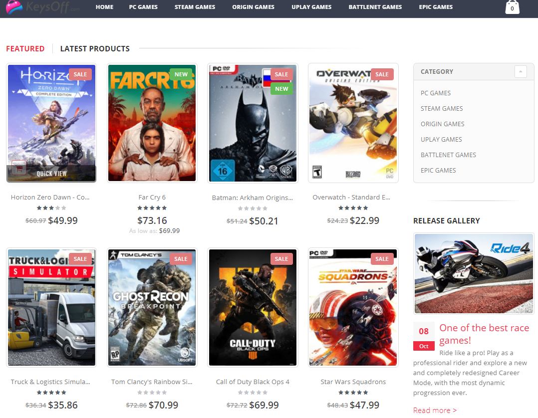 На сайте магазина KeysOff есть много предложений, которые не принимают участия в распродаже. Например, на главной странице на момент написания статьи размещены Horizon Zero Dawn – Complete Edition, Far Cry 6, Truck & Logistics Simulator, Star Wars Squadrons и CoD Black Ops 4. Но об играх мы поговорим чуть позже.