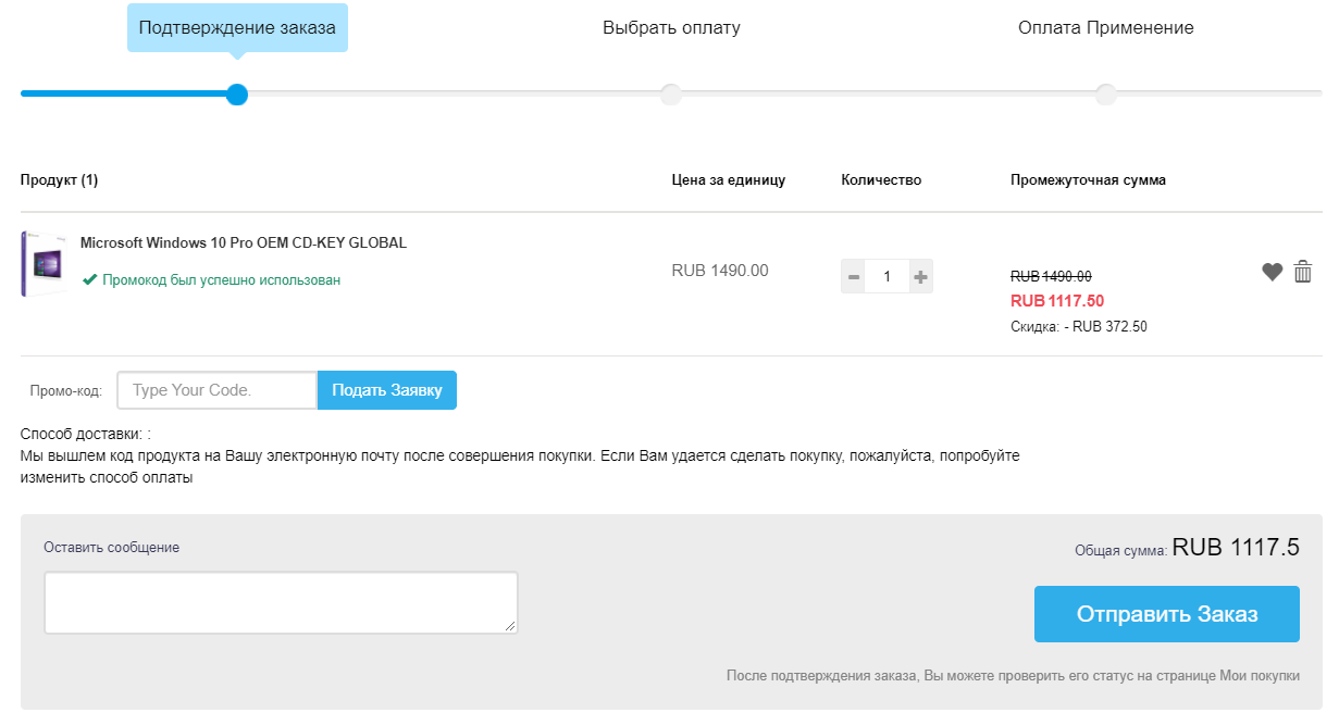 Уже в корзине нужно ввести промокод для скидки. В поле «Промо-код» пишем OC25 и жмём кнопку «Подать заявку». После этого стоимость ключа не будет снижена, и вы сможете купить Windows 10 Pro за 1 117 рублей вместо 1 490 рублей.