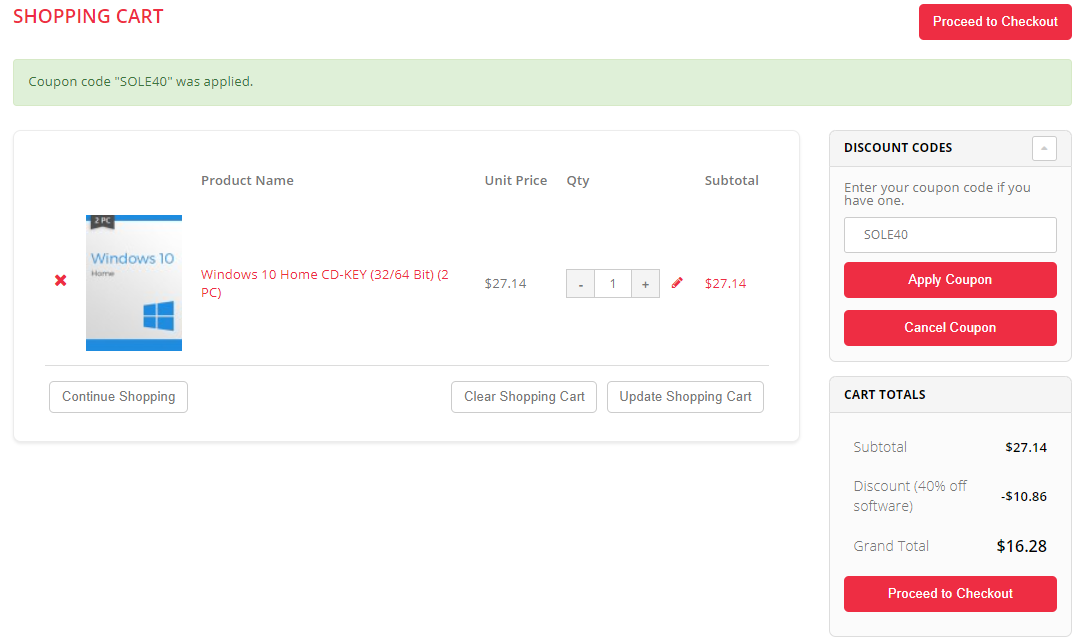 Мы же рассмотрим процесс оформления заказа на примере двух лицензий к операционной системе Windows 10 Home. Стоимость составляет чуть более 27 долларов. После активации купона SOLE40 она падает почти на 11 долларов и составляет порядка 16 долларов.
