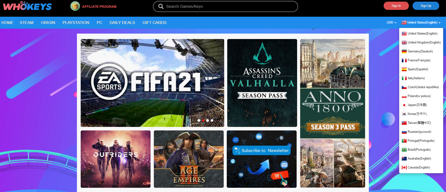 Как мы писали чуть выше, на сайте Whokeys есть несколько категорий, в которых можно найти игры, дополнения к нем и ещё несколько других предложений. Например, в разделе PlayStation можно приобрести подарочные карты и ваучеры для пополнения кошелька. Их же можно найти и в категории Gift Cards.