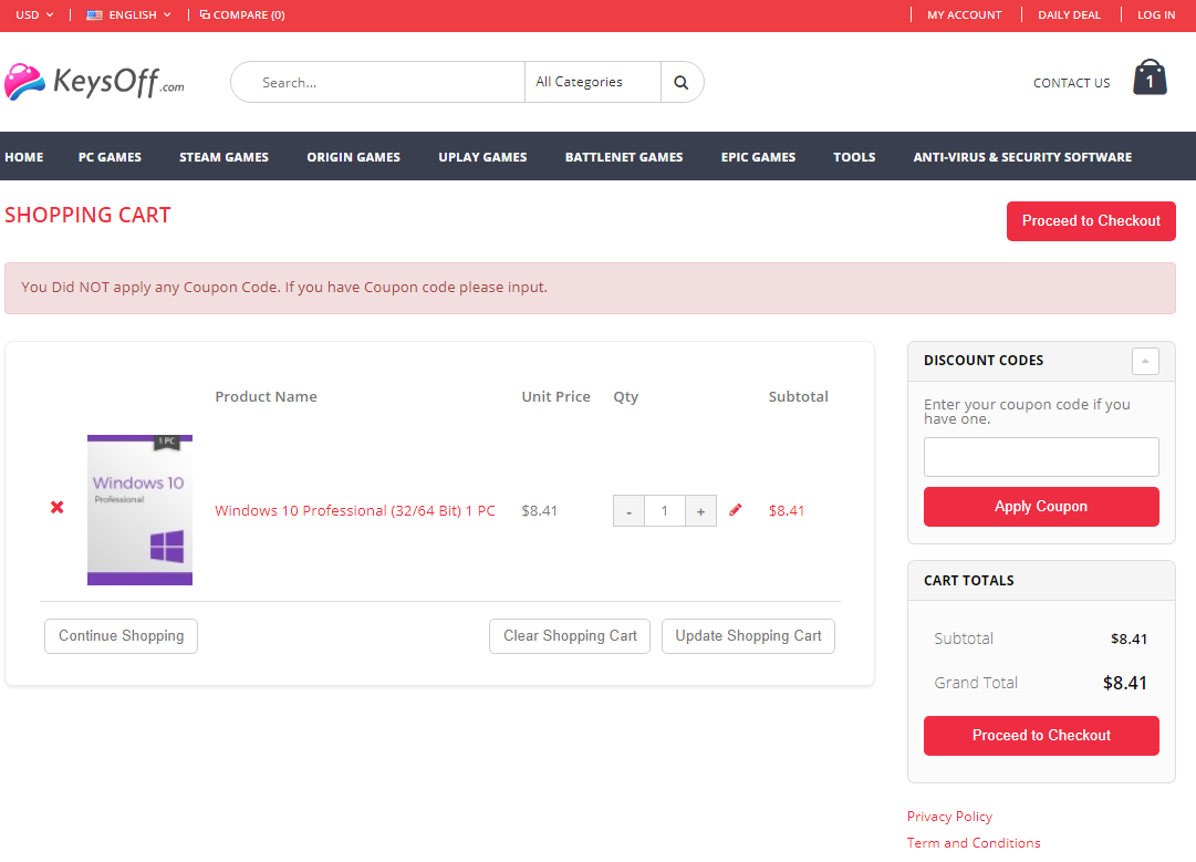 Переходим на сайт KeysOff и видим, что стоимость ключа составляет 8,41 доллара. Как мы отмечали ранее, вводить промокод не нужно. Нам надо только нажать Add to Cart, а затем перейти в корзину.