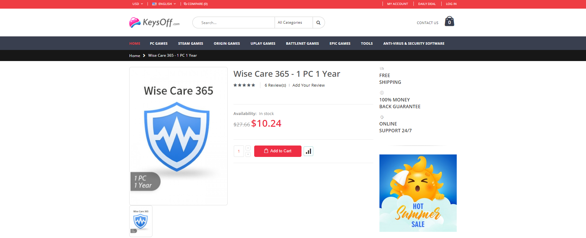 Напоследок давайте уделим внимание утилитам. Соответствующий раздел появился в магазине KeysOFF относительно недавно, несколько месяцев назад. Первая из доступных на распродаже утилит называется Wise Care 365. Она ориентирована на повышение стабильности, производительности и безопасности Windows. Программное обеспечение можно использовать для очистки реестра, диска и остальных компонентов в ПК.