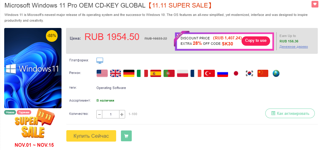 Начало ноября – время распродаж. В Китае в первый день последнего месяца осени по традиции стартует распродажа Double 11, она же Double Eleven, она же просто 11.11. Свою акцию запустил и магазин ключей для программного обеспечения SuperCDK. Сейчас прекрасное время перейти на лицензионный софт, ведь он доступен с большими скидками. Например, ключ для операционной системы Windows 10 Pro можно купить лишь за 1000 рублей, а лицензия на Windows 10 Home стоит итого меньше. Windows 11 тоже предлагается по акции. Но обо всём по порядку.