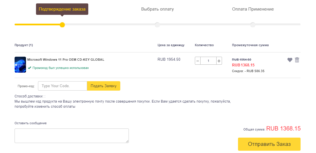 В корзине вновь видим цену, которая нас не особо устраивает. Поэтому в поле Type Your Code вводим промокод OCVIP и жмём «Подать заявку». Спустя пару секунд цена будет снижена почти на 600 рублей и составит 1 368 рублей с копейками, как мы и писали ранее.