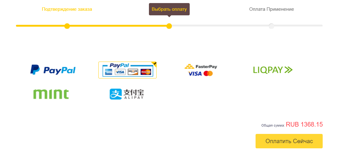 Теперь нажимаем «Оформить заказ» и переходим к выбору платёжной системы. Мы рекомендуем использовать PayPal, ведь вы без труда можете привязать свою банковскую карты и средства будут списаны сразу с неё. Но есть и другие способы: