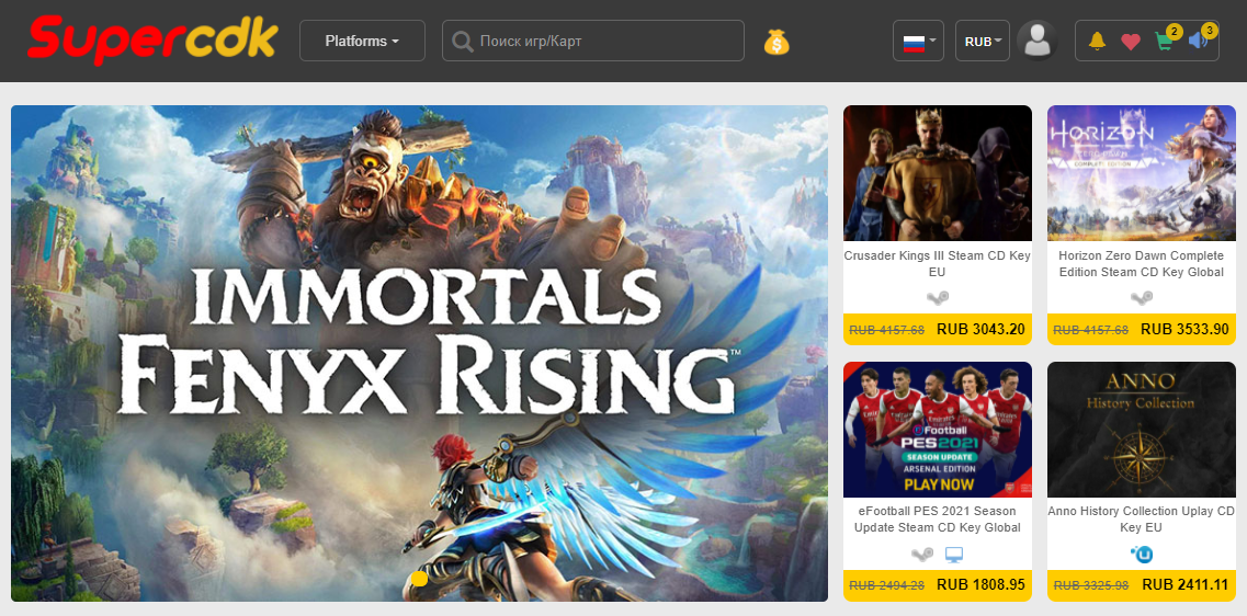 Что касается категорий продуктов, представленных на сайте, то первая называется Steam. Тут находится почти пять сотен предложений. В большинстве это игры. И да, чтобы открыть список категорий, нужно нажать на кнопку Platforms рядом с логотипом сайта. В разделе Steam первыми в списке идут Age of Empires 4 Deluxe Edition, Age of Empires 4 Standard Edition, Life is Strange True Colors, Marvel’s Guardians of the Galaxy и Guilty Gear Strive Standard Edition. Их стоимость составляет от 3 000 рублей до 4 100 рублей.