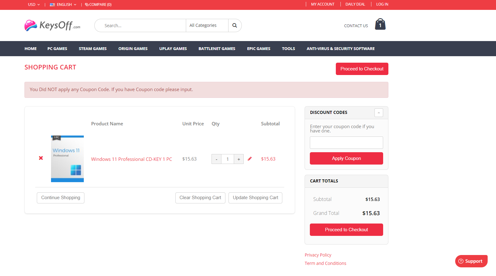 Поскольку нам не нужно вводить промокод в случае с Windows 11 Pro, можно переходить к оформлению заказа, нажав на кнопку Proceed to Checkout.