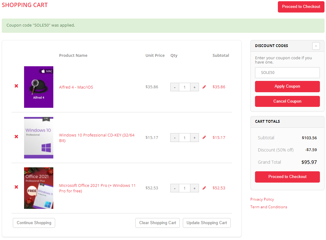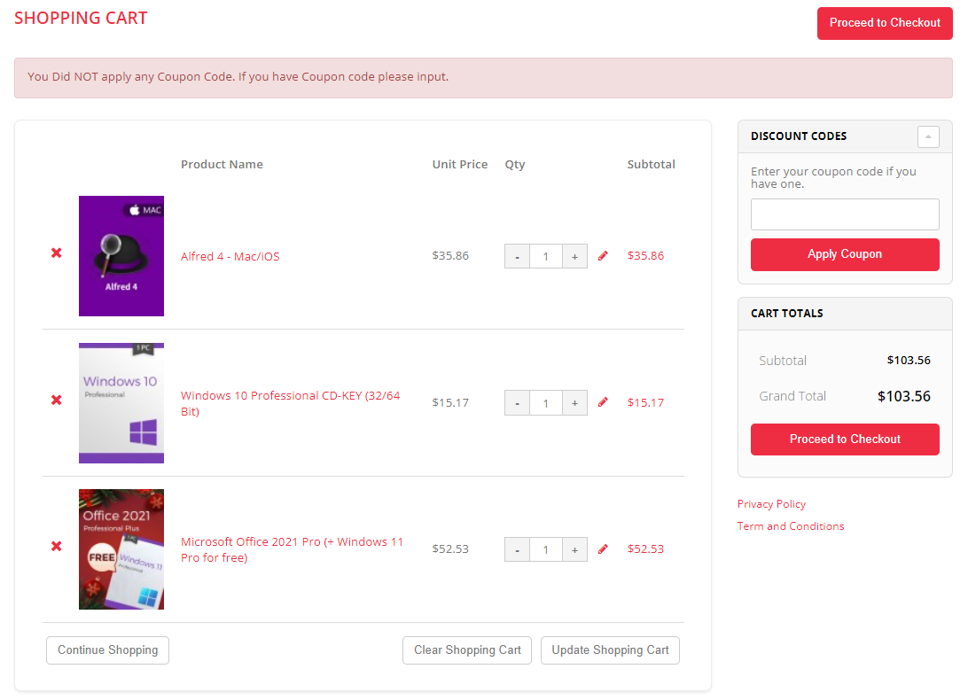 Промокодов для Alfred 4 и MS Office 2021 Professional Plus не предусмотрено. Теперь можно смело нажимать на кнопку Proceed to Checkout и переходить к оформления заказа.