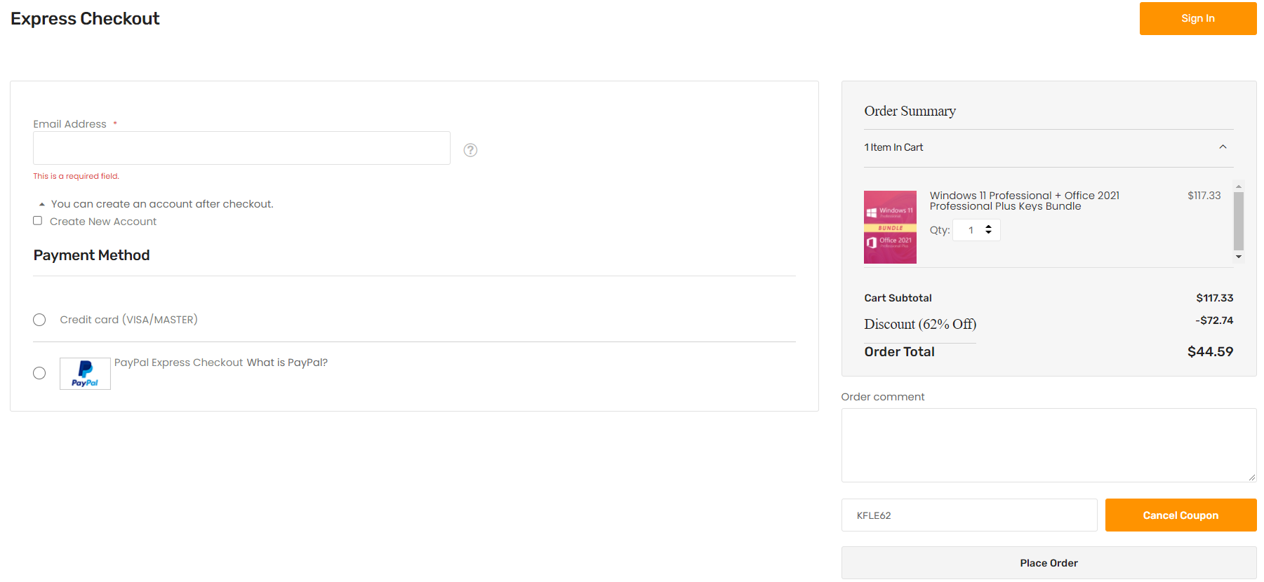 Достаточно просто добавить комплект в корзину, нажав Add to Cart, и перейти самому туда кликом по кнопке View Cart и активировать купон. В корзине справа открываем спойлер Apply Discount Code и вводим промокод KFLE62, который дарит 62-процентную скидку.