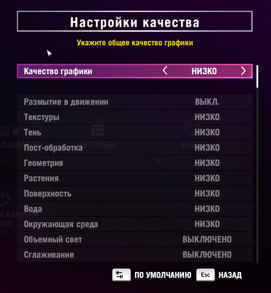 Минимальные настройки графики, вертикальная синхронизация отключена. Этот режим показывает, какую минимальную нагрузку на систему мы можем получить в игре, без потери играбельности.