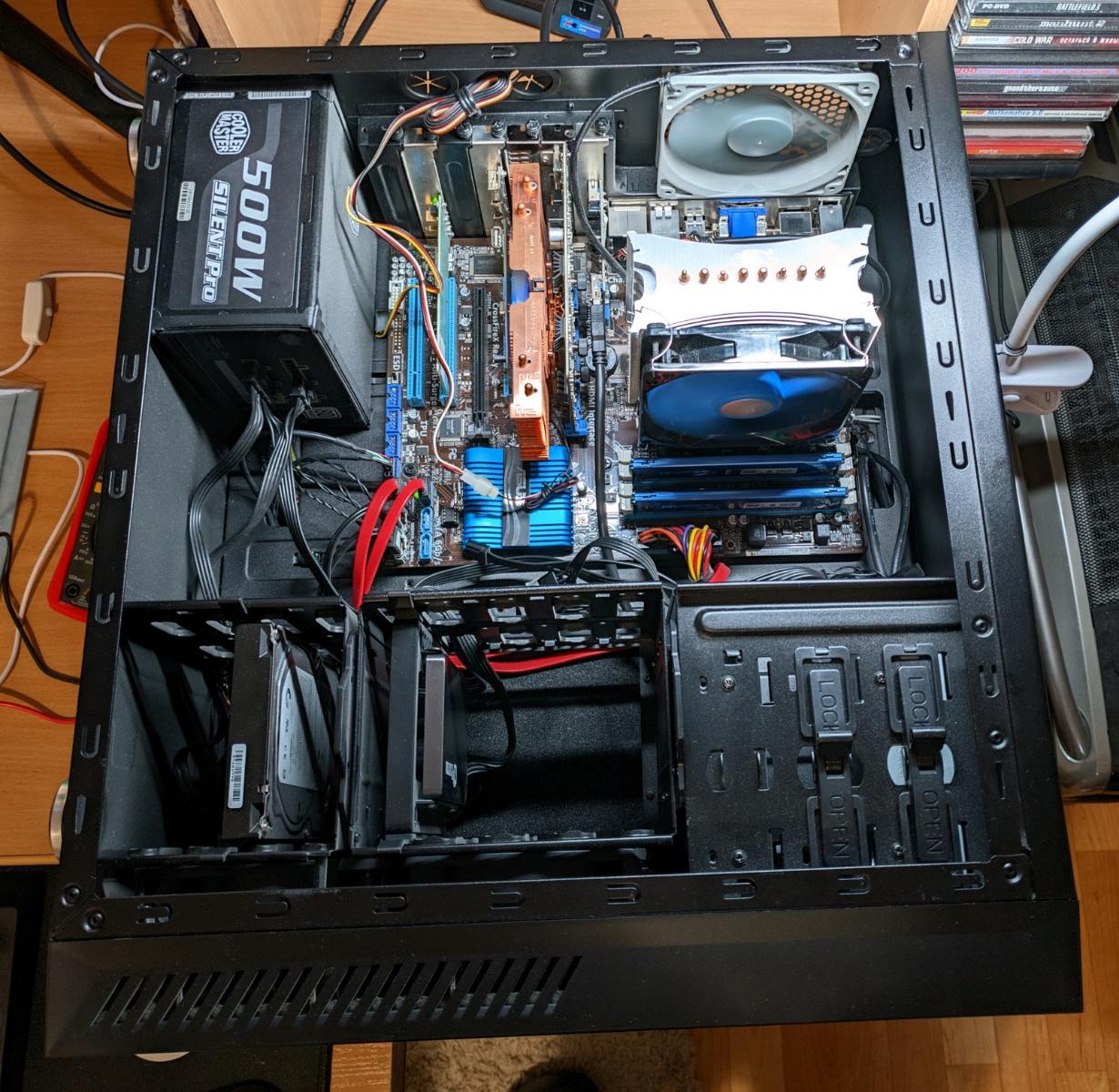 Разумеется, компьютер не основной, принадлежал не так давно умершему родственнику, безразличному к играм. Собран в начале 2012 года, немного изменён по ходу времени (например установлен качественный SSD с аппаратным буфером под операционную систему когда те приемлемо подешевели). Видеокарту заменил на имевшуюся в моих запасах GeForce GT 1030 (GP108-300-A1) по причине необходимого в данных условиях малого тепловыделения видеочипа и возможности дополнительно ещё ограничить его тепловыделение по обстоятельствам. Система охлаждения использовалась та же, что и в предыдущей части, а именно Zalman VF1000, потому что для подобного тестирования по определению нужна "горячая точка" с малым тепловыделением и к ней избыточная система охлаждения. А также при необходимости навести баланс между тем и другим, тут хитрить пока не пришлось.