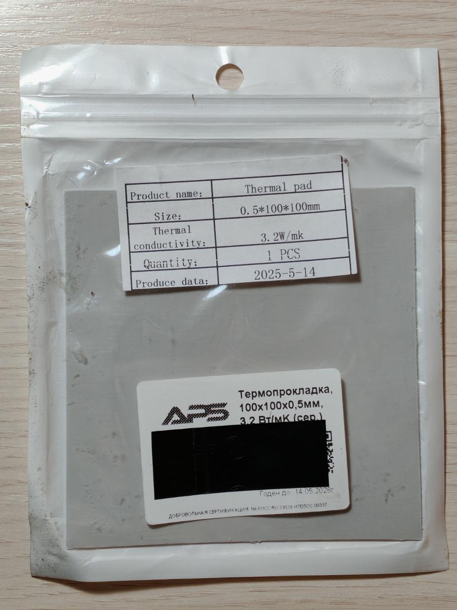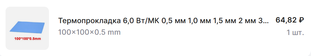 Пока слабовато на фоне конкурентов. Максимальная температура 64 градуса, средняя температура 61.50 градуса. Насколько помню - прокладка сравнительно плотная, не рвалась при снятии системы охлаждения с графического чипа, упругость на сжатие больше чем у "голубых арктиков" из пункта 2.1. Лист размером 80×40 мм (под радиаторы двух NVMe SSD накопителей?) куплен в конце октября 2025 года за 207 рублей, в момент вёрстки статьи (начало декабря 2025) его цена 312 рублей. В пересчёте на "полный" лист (в виде которого в продаже отсутствуют) 100×100 мм обходится в 647 и 975 рублей соответственно. Недёшево.