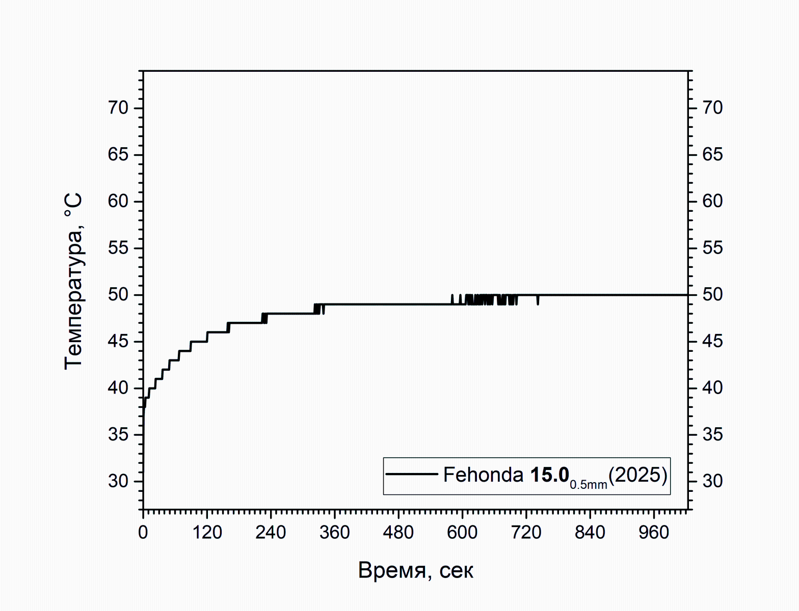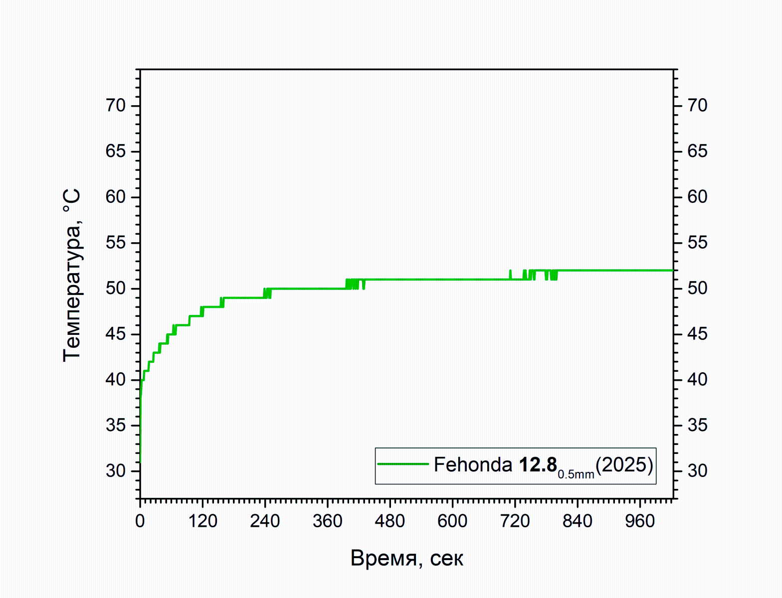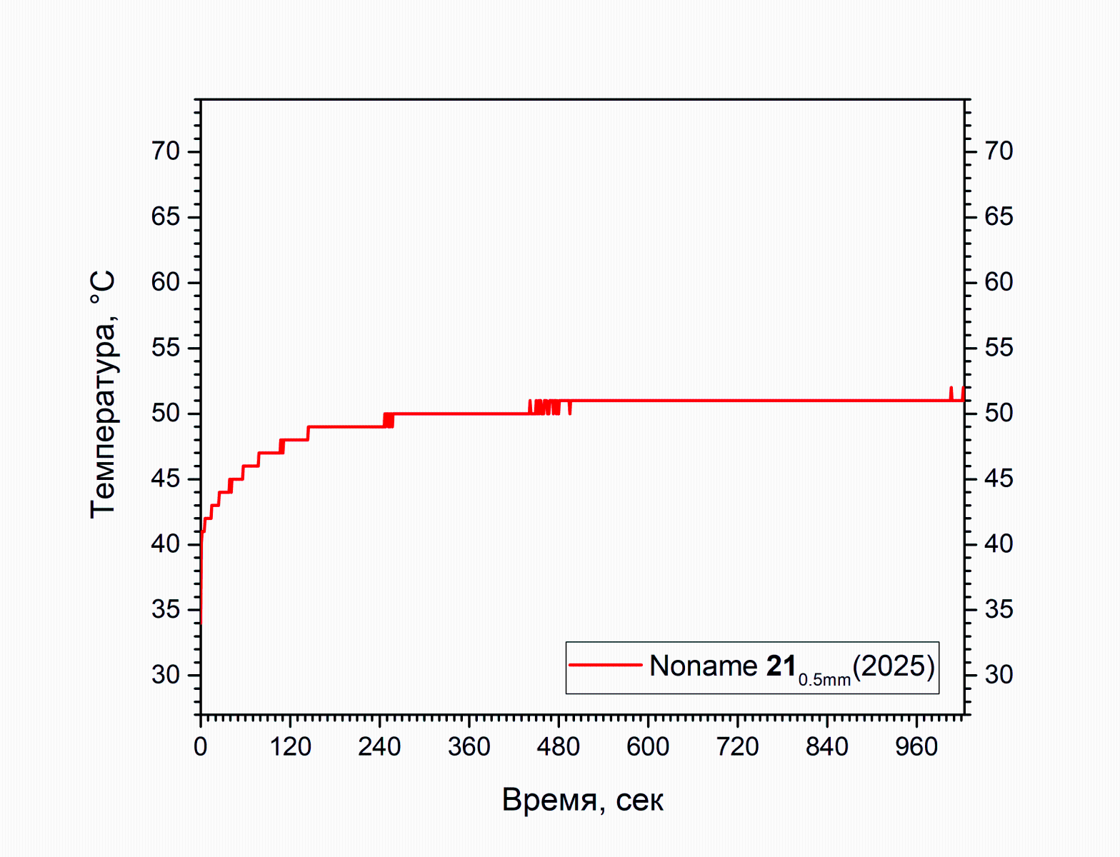 Повторное нанесение и тестирование при тех же условиях дало сходный результат. Кривая была намеренно утеряна, чтобы не засорять исходники, температура снова не выбралась выше 50 градусов.